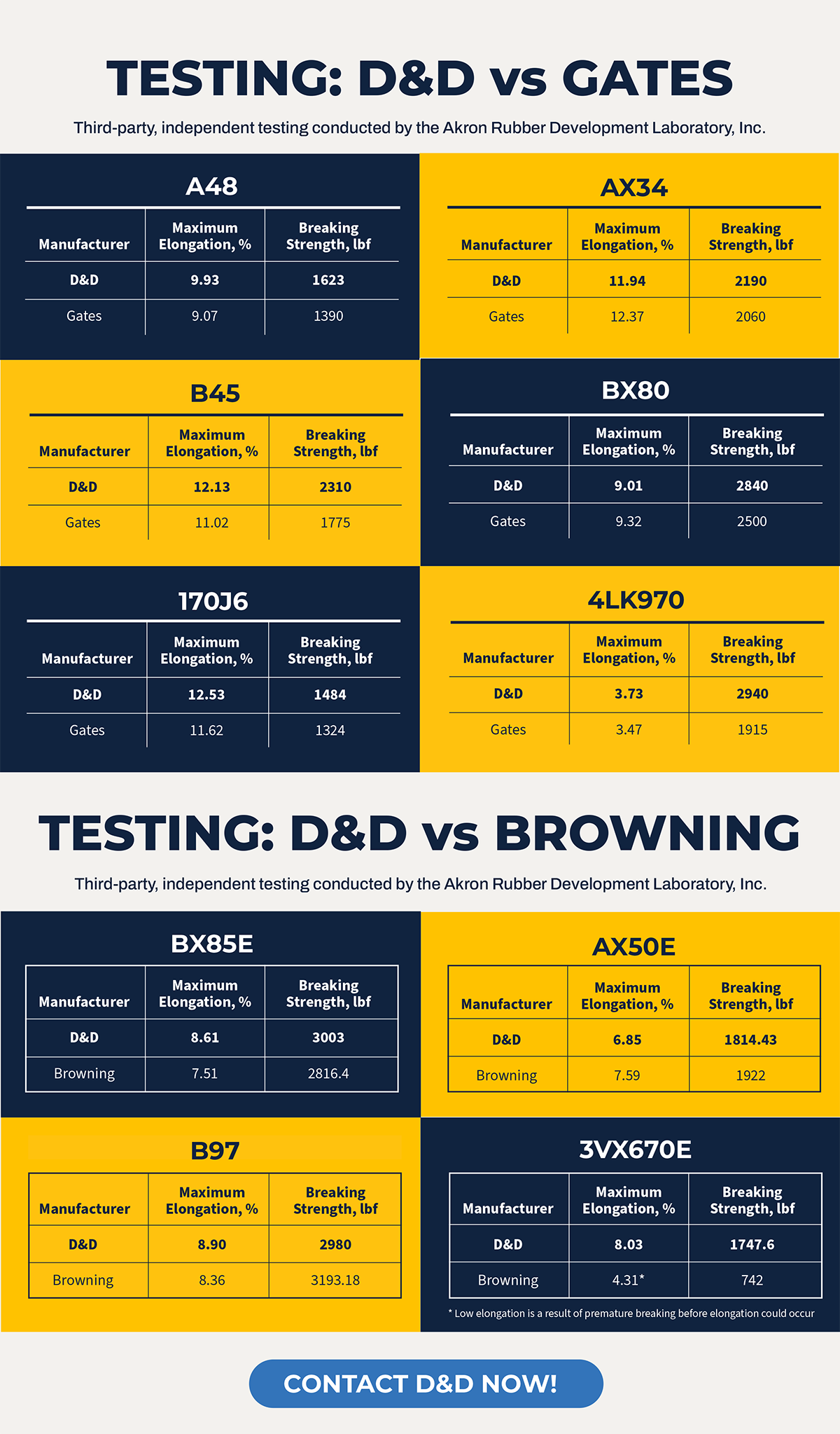 Yes. And they won! Our belts are independently tested by Akron Rubber Development Laboratory, a third-party testing facility. D&D belts outperformed competitors like Gates and Browning in both break force strength and elongation.